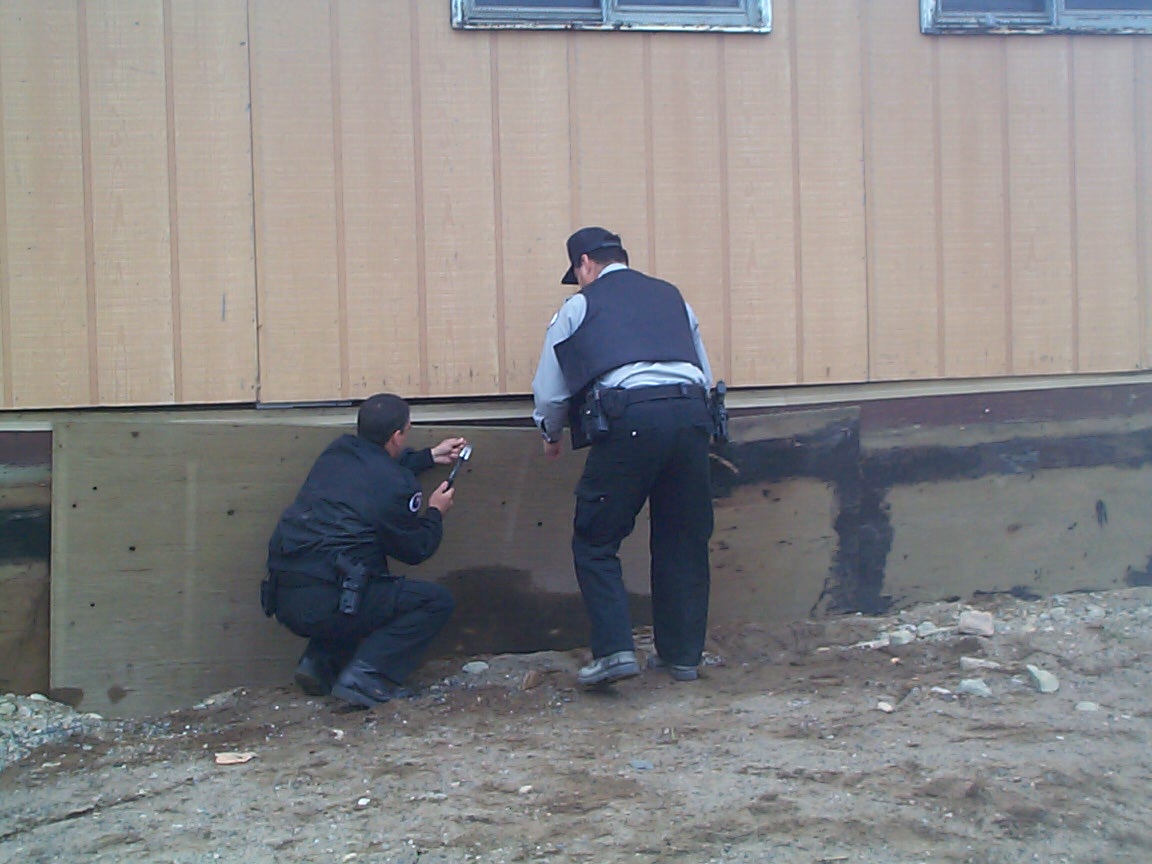 Nailing down the board that had a open space under KiHS. Later when they were done, Nicholas came by, and pushed sand against t
