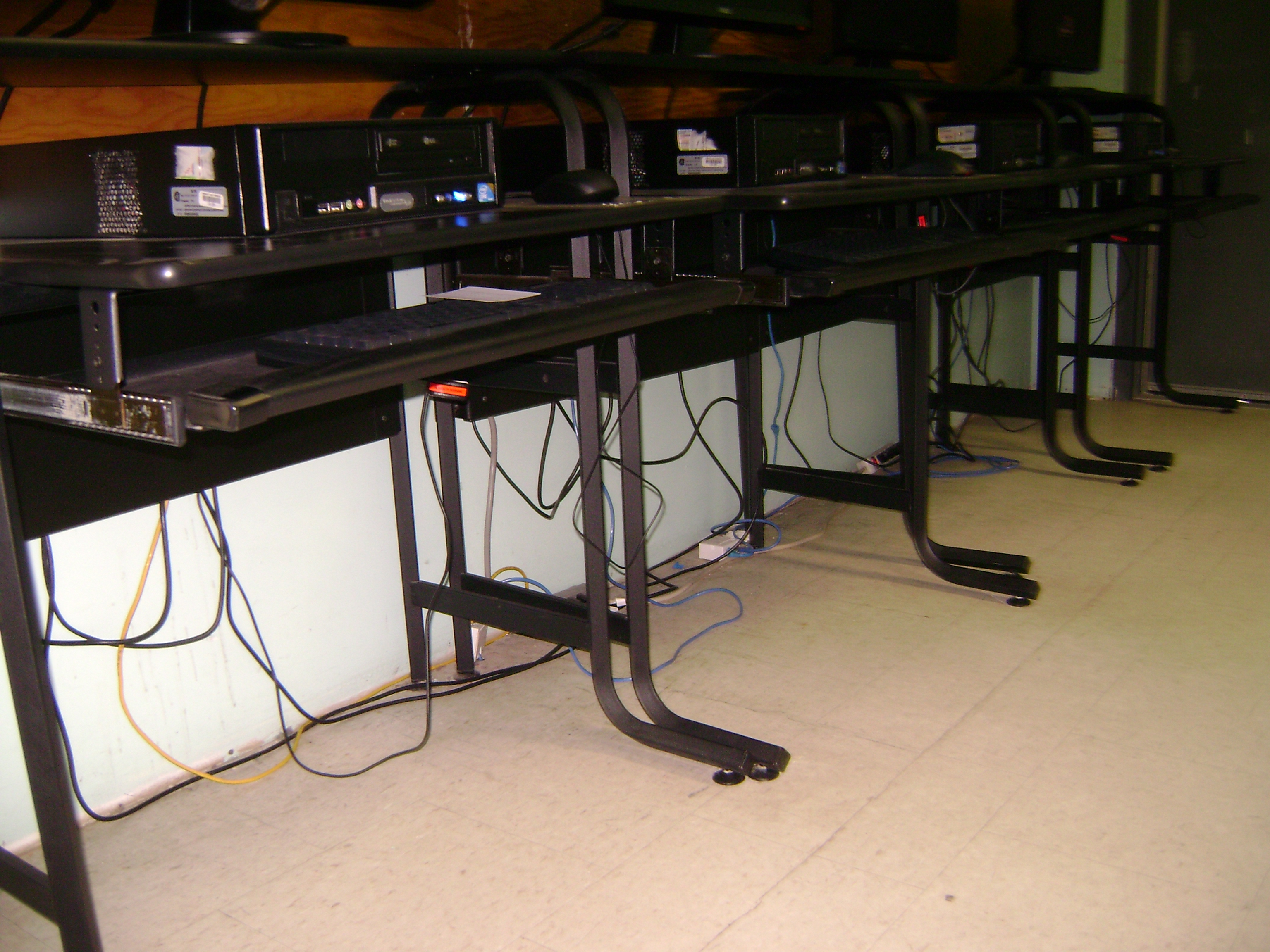 four PCs on back wall of library.