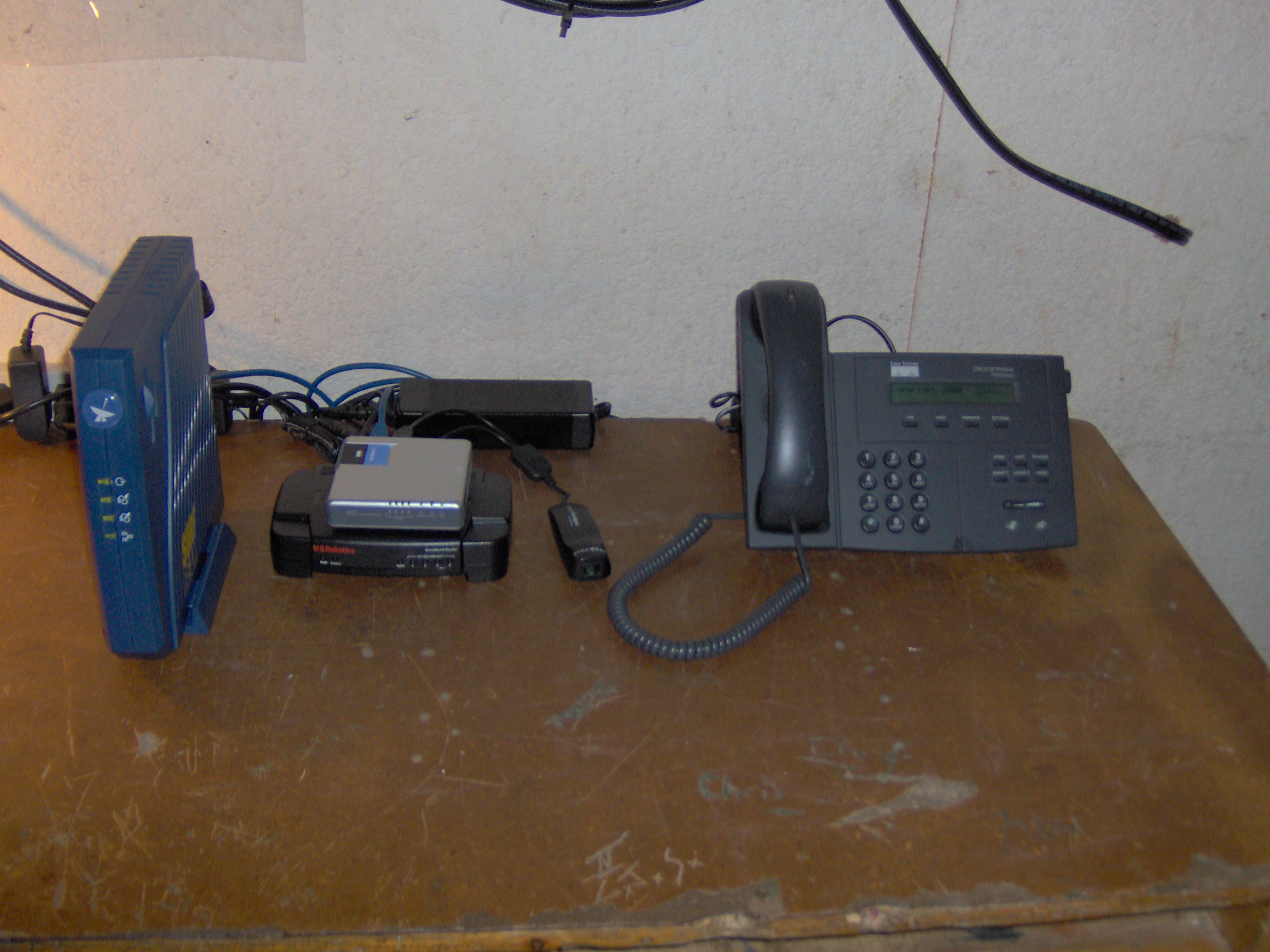 Ka satellite modem (left) wireless router equipment and Cisco IP telephone