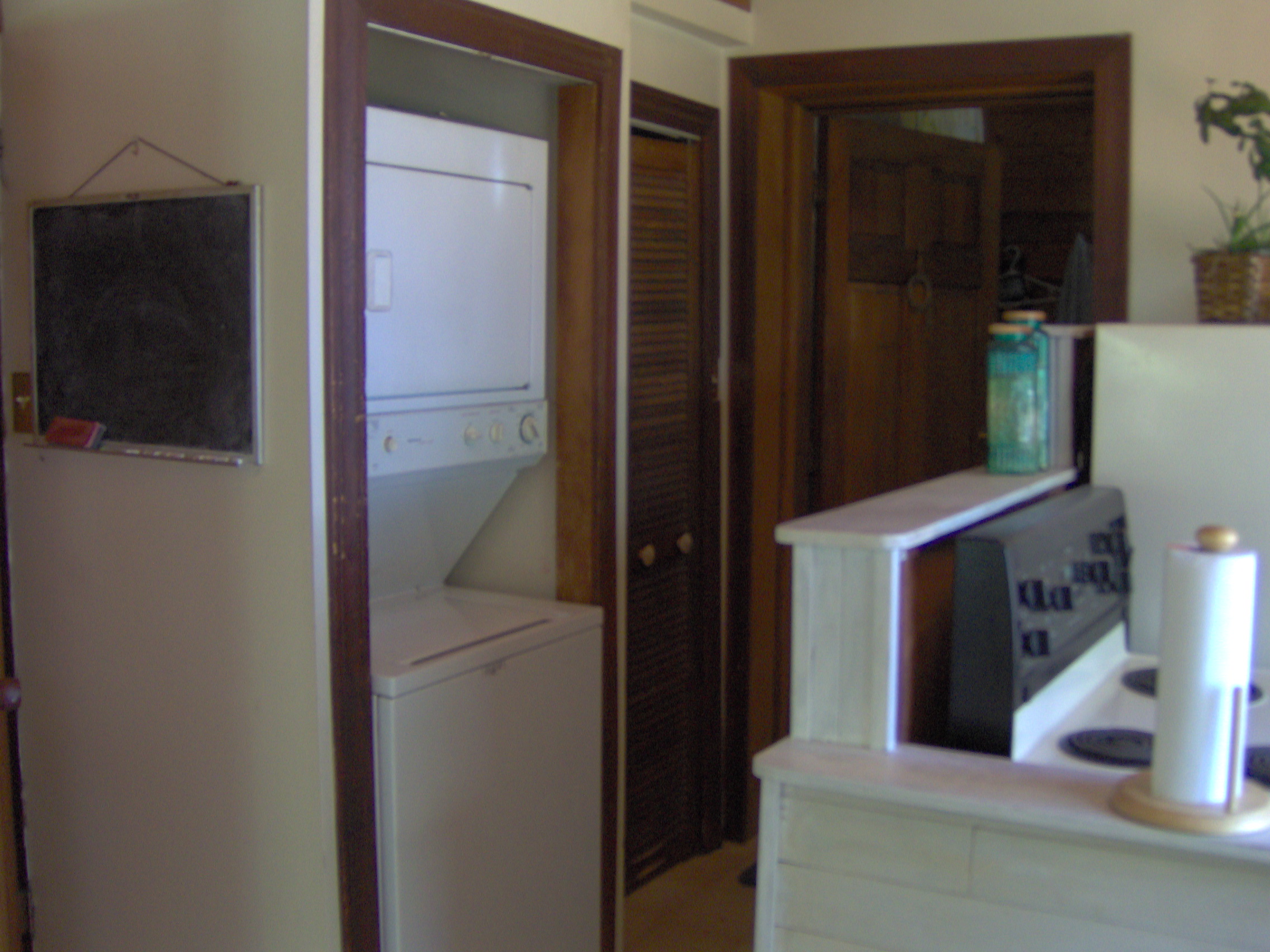 The hallway with the washer and dryer with the doorway to the entrance that leads to the other two bedrooms