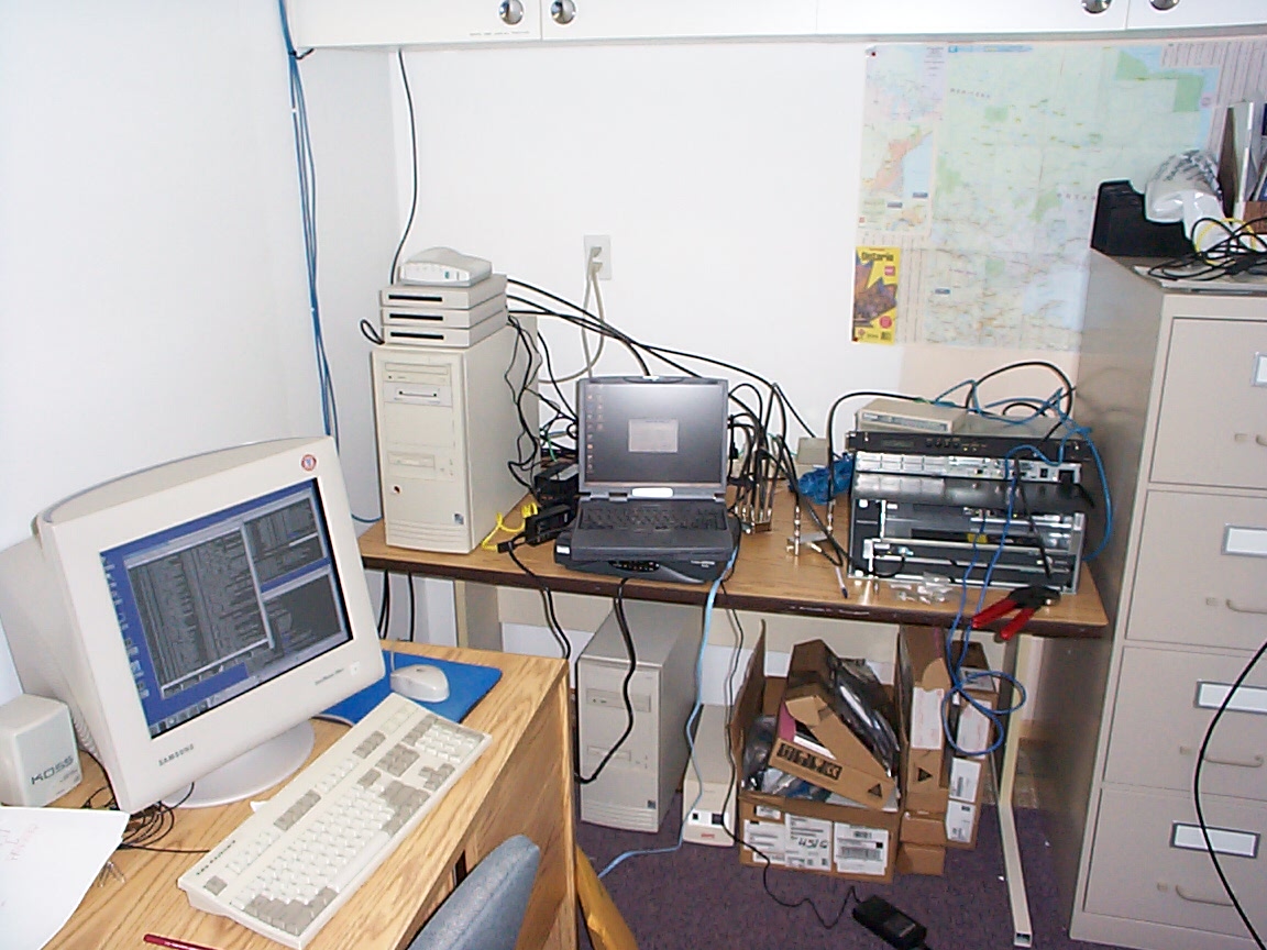 A DOCSIS cable plant on one table. The Cable Network Registration server is to the left with a number of cable modems on top. I