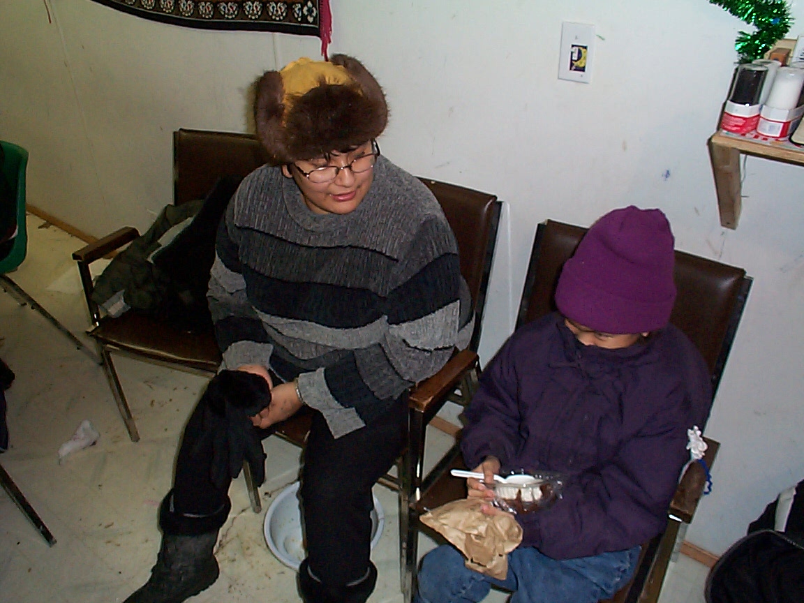Here is the Keewaywin school counsellor and one of the students, Anita Kakegamic. They have just finished eating. (thats my cous