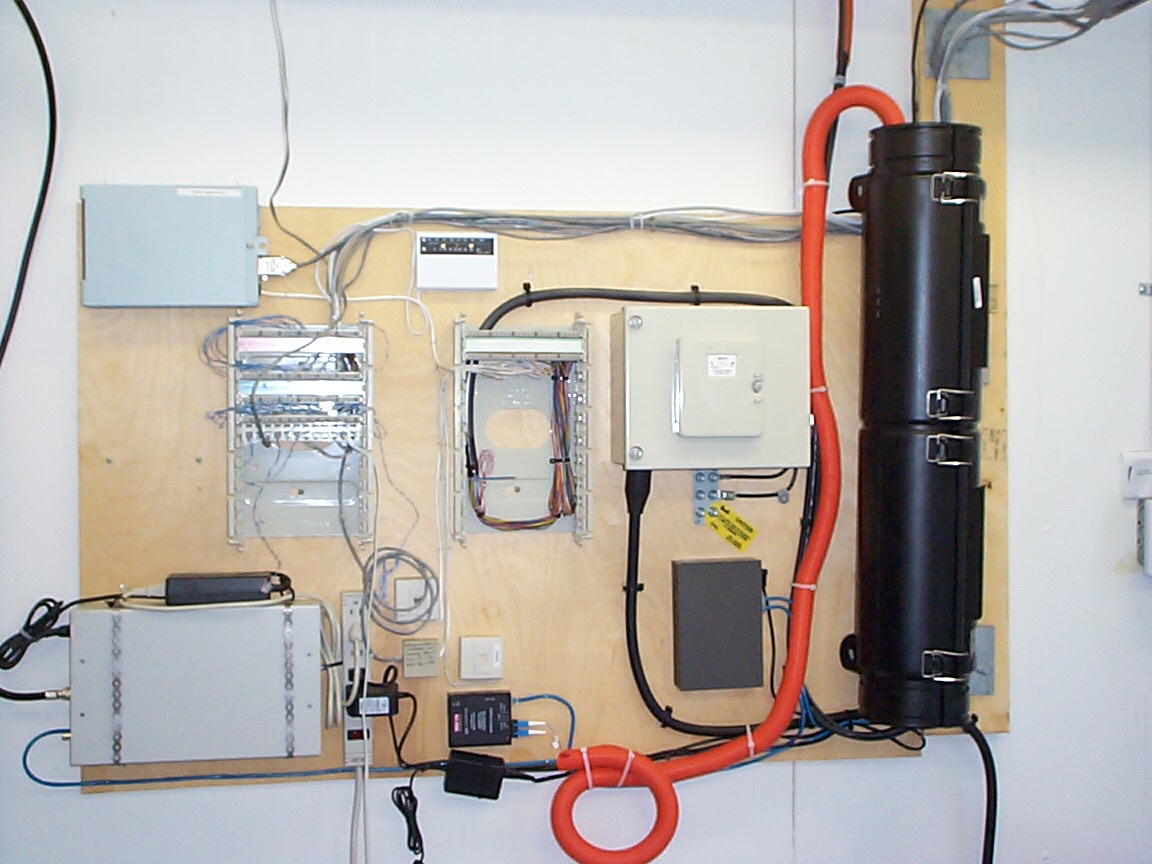 The splice enclosure mounted to the wall and fiber run to the transceiver for the wirless radio.