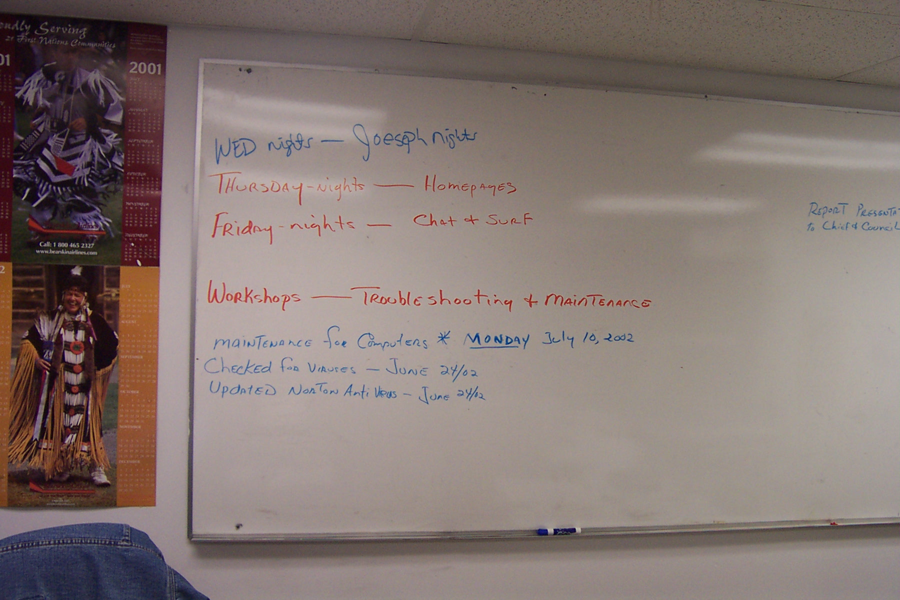 this is our white board where we put up the daily happenings and upcoming schedules of the Keewaywin e-centre