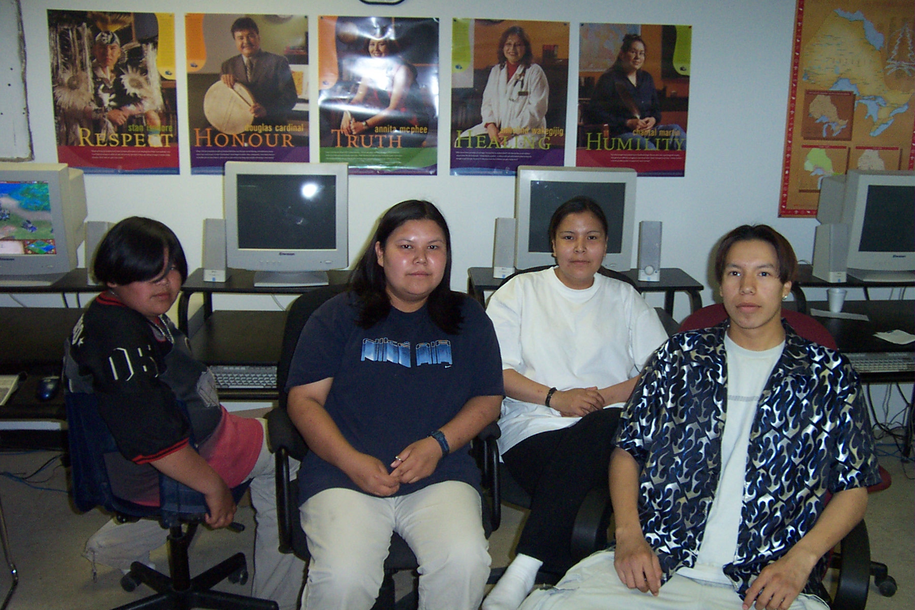 And here we have our Keewaywin E-center summer students. On the left is Reggie Kakegamic, Carrie Kakepetum, Maxine Kakepetum and