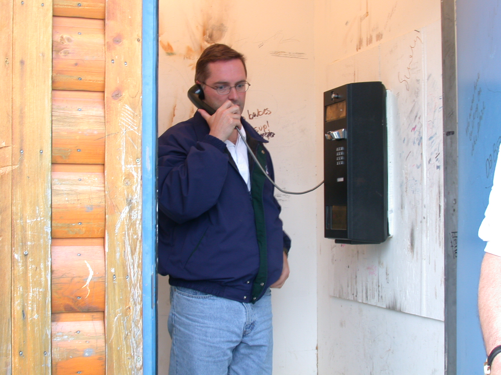 Paul testing the single toll phone in the community (probably phoning Bell to tell them that they can easily add more lines to t
