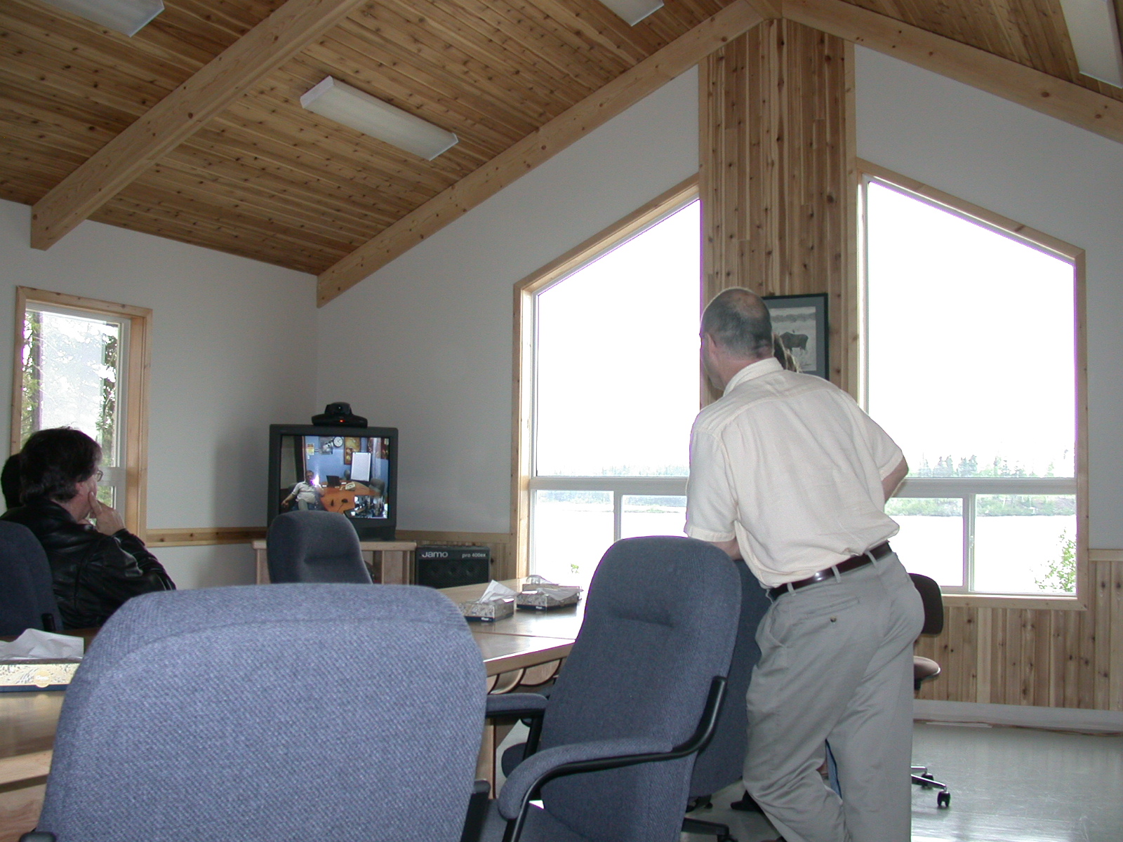 Meeting with John Moreau via video in the Slate Falls Band office board room