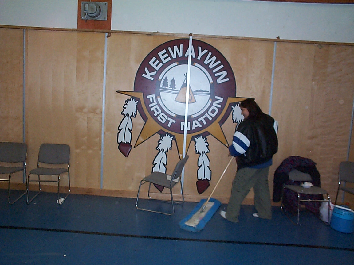 Thats Allison Kakepetum sweeping up the floor by the Keewaywin Logo.