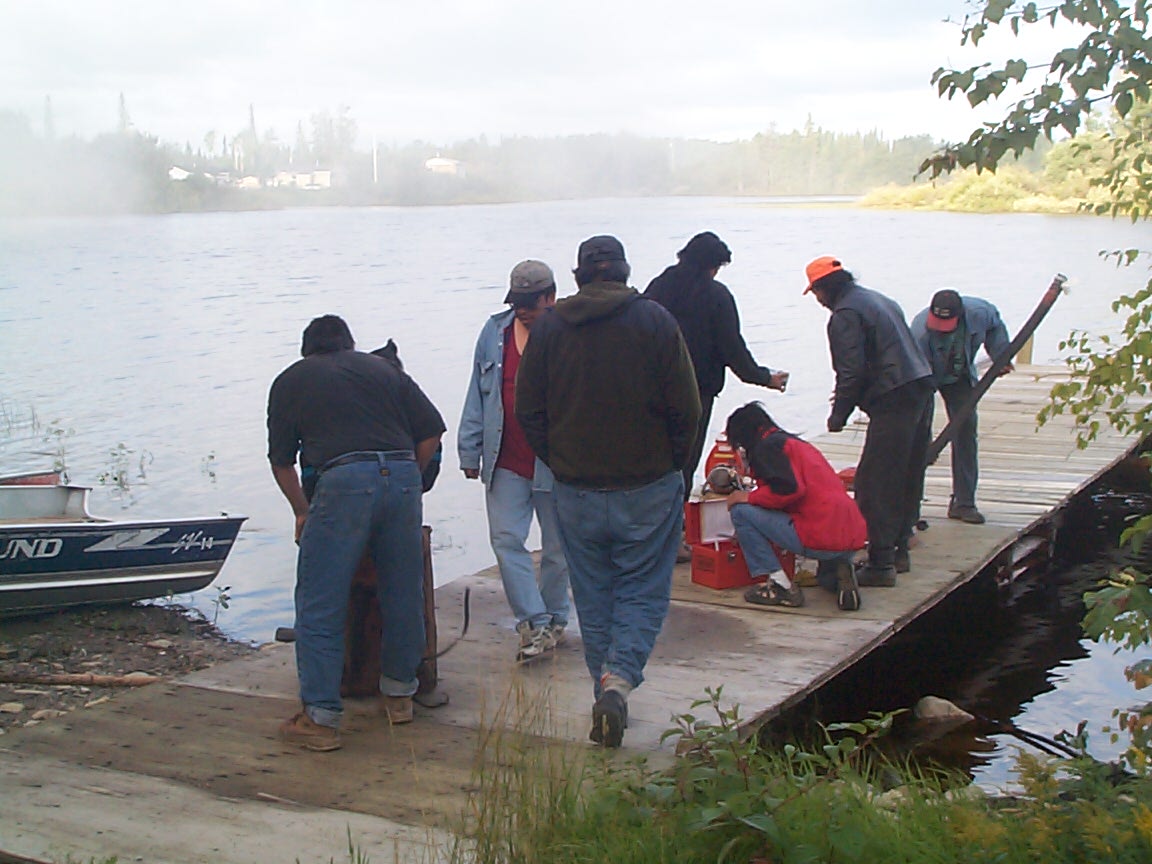 Getting the water pump going, after Susan Rae brought gas from her truck.